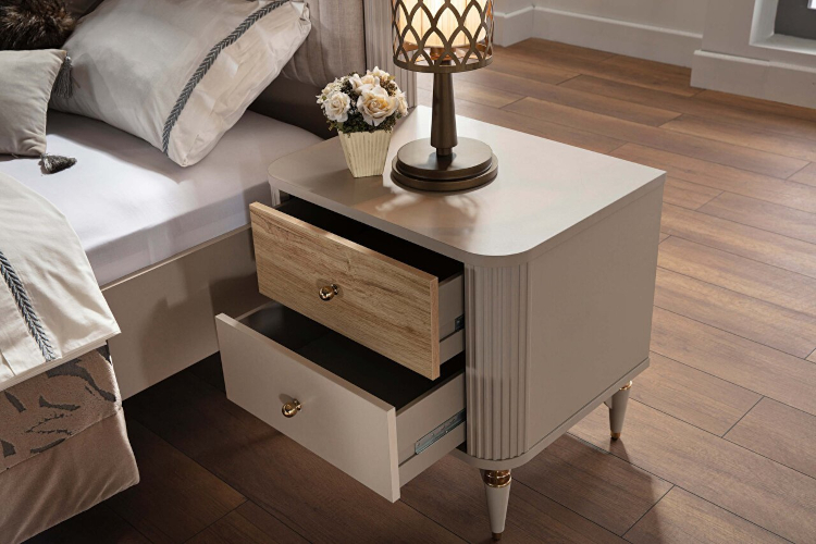 Современная модель размером 62×47×61 см с элегантными деталями. Выполнена в кремовом цвете с деревянными вставками цвета дуб. Ручки и ножки с глянцевым золотистым покрытием подчеркивают стиль коллекции.