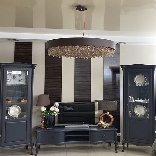 Отделка: каркас окрашен в коричневый цвет, особенным украшением являются разноцветные стразы, завершающие весь образ люстры.